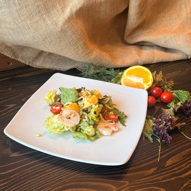 Кальмары, креветки, салатные листья, помидоры черри, мякоть апельсина, кедровые орешки, соус на основе апельсинового сока и оливкового масла