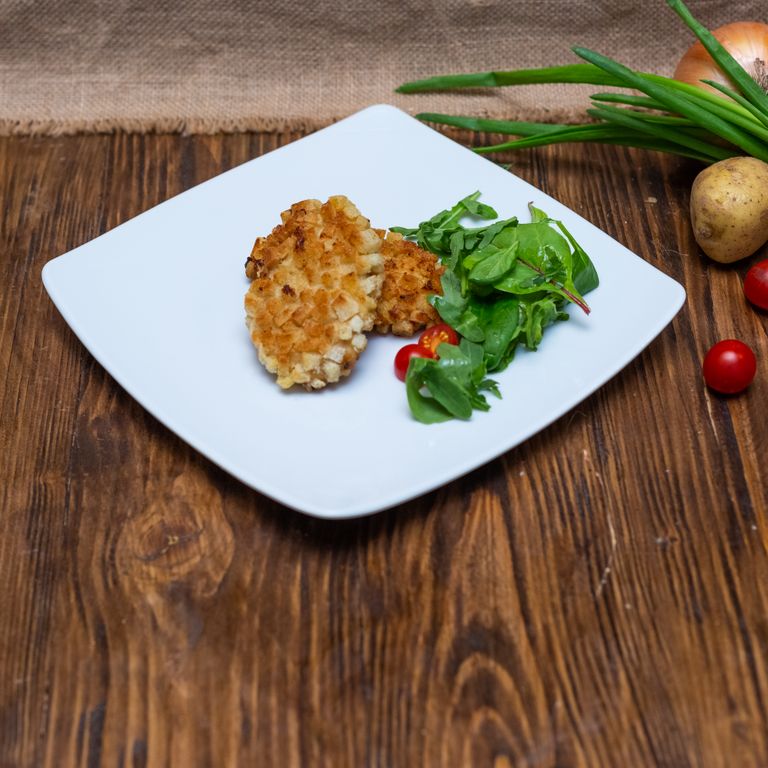 Нежная куриная котлета со сливочным маслом в хрустящих белых греночках, подаются с салатными листьями и помидором черри