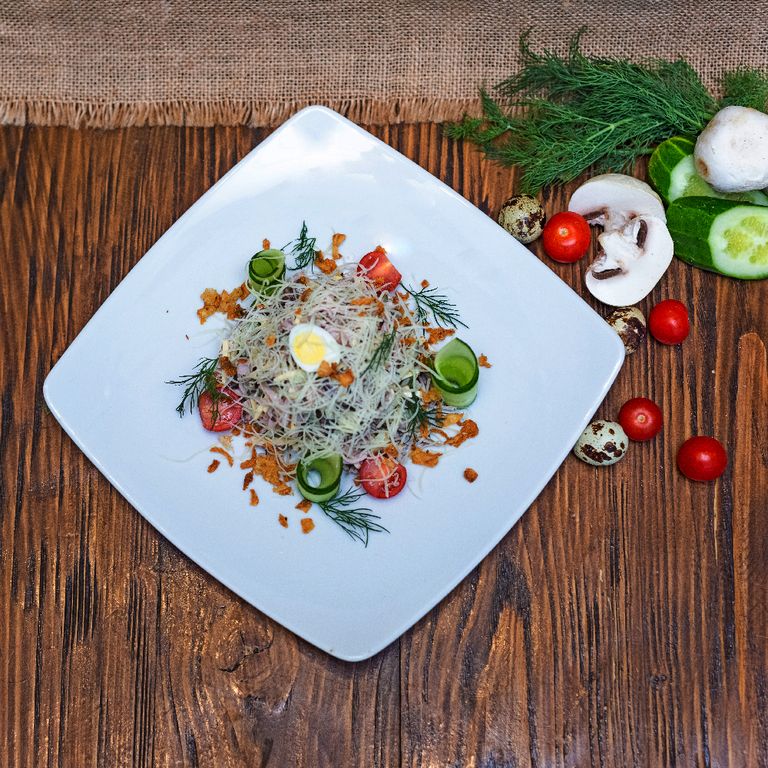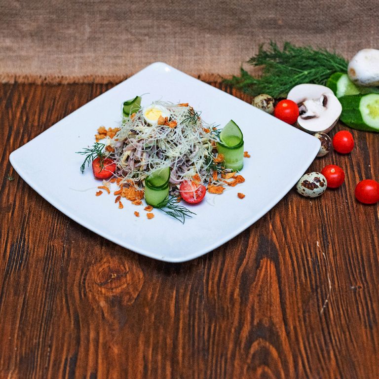 Язык говяжий, ветчина, соленые и свежие огурчики, свежие шампиньоны и два вида сыра, майонез, горчица, подается с перепелиным яйцом и помидорами черри 240гр/ 486ккал