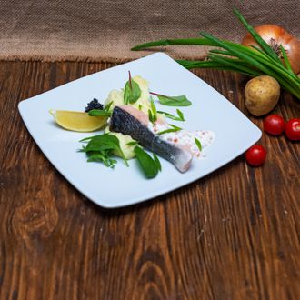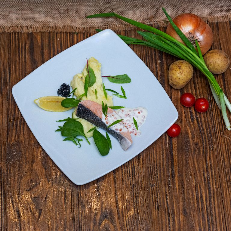 Нежное филе семги, приготовленное на пару с лимоном и розмарином, подается с картофельным пюре и сливочно-икорным соусом 90/150/60гр/652ккал